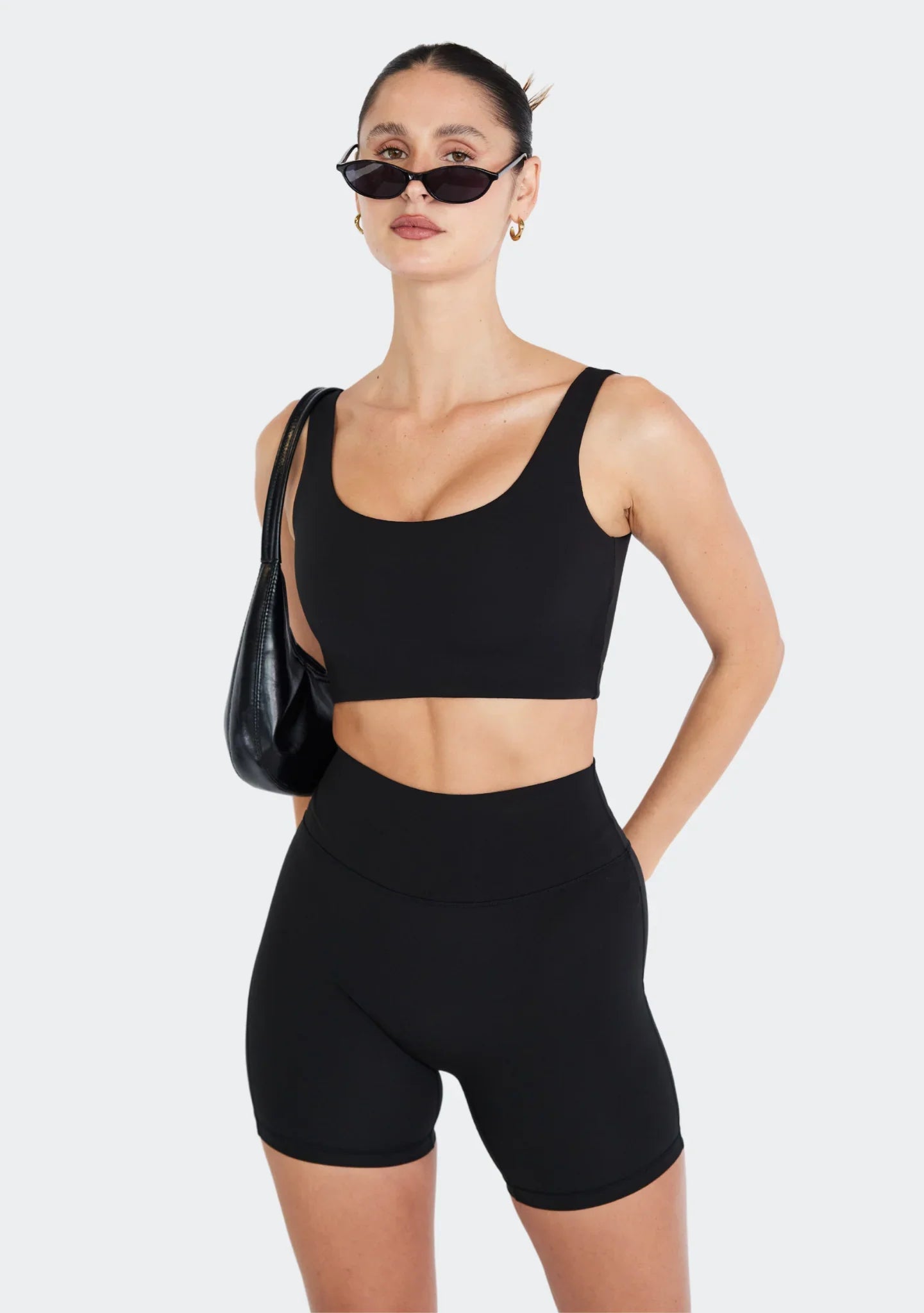 Sexiest and most flattering sports bra, doesn't buldge and smooths everything out. Obsessed with the low back and is so so supportive. Material is so buttery and doesn't make you feel so restricted like other sports bras.